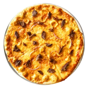 At the heart of this pizza is our slow-cooked beef brisket, tender and juicy with a deep, smoky flavor. Paired with caramelized red onions, a creamy layer of mozzarella, the sharpness of cheddar cheese, and topped with fresh tomato stake slices, it’s a perfect balance of savory, cheesy, and refreshing. Every bite is baked on our signature crust—crispy on the outside, soft on the inside—for that satisfying texture true pizza lovers crave.
