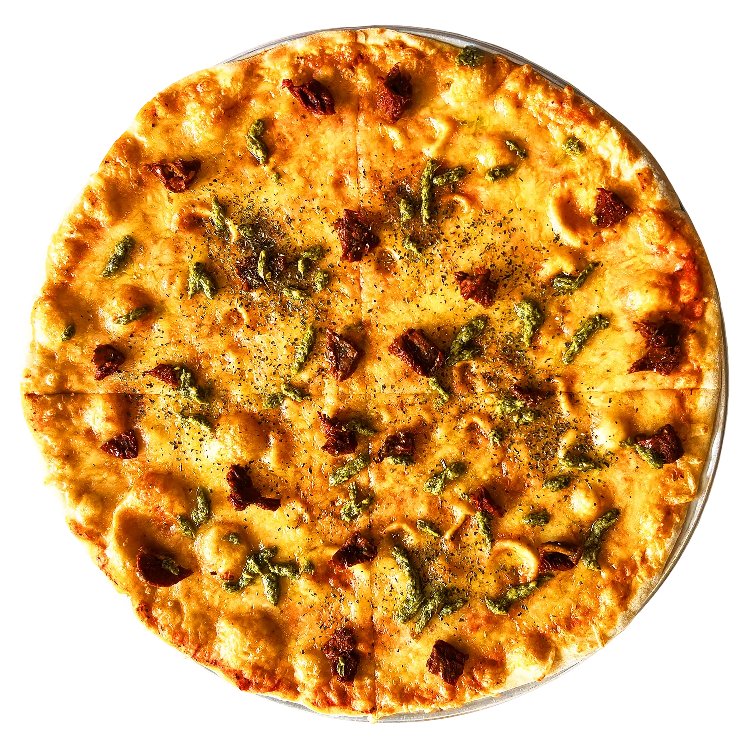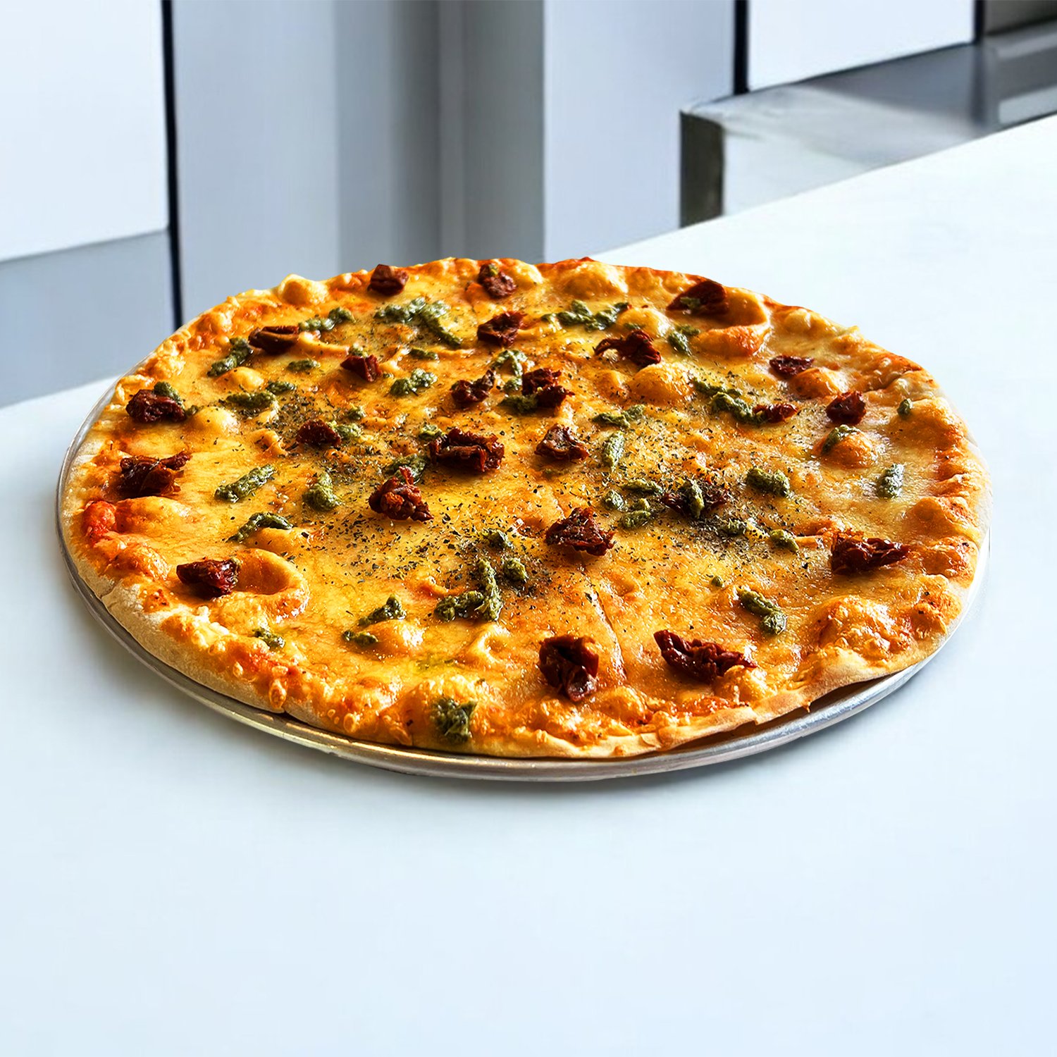 The star of this pizza is sun-dried tomatoes, delivering a rich, slightly tangy sweetness that pairs beautifully with our zesty tomato sauce base. Layered with creamy mozzarella and sharp cheddar cheeses, every bite is gooey, golden, and full of flavor. To elevate it even further, we add fragrant basil leaves and a swirl of green pesto, bringing freshness and an aromatic depth that makes this pizza truly shine.